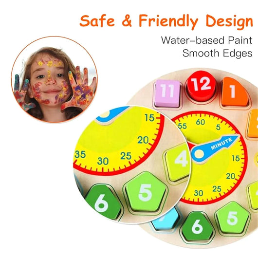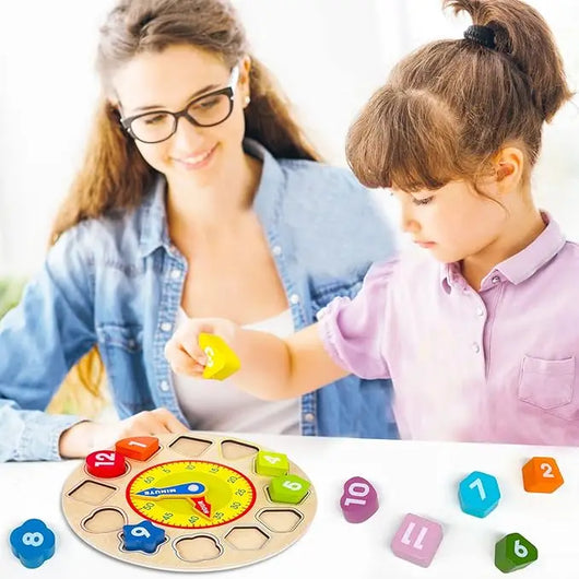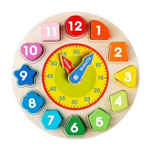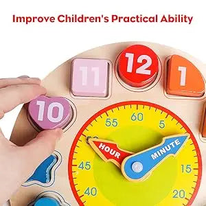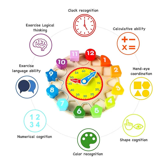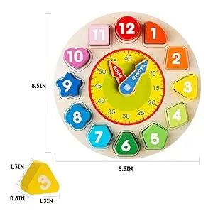 Diese farbenfrohe Montessori Lernuhr aus Holz wurde speziell für Kinder entwickelt, um spielerisch das Erkennen von Zahlen, Farben, Formen und das Verstehen der Uhrzeit zu fördern. Mit 12 herausnehmbaren Holzblöcken in verschiedenen Formen und Farben sowie beweglichen Stunden- und Minutenzeigern bietet sie vielfältige Lernmöglichkeiten.